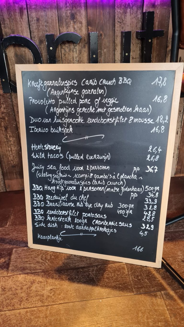 “Ruime wisselende keuze vind je in ons standaardmenu en een suggestiebord, met klassiekere gerechten, maar ook gerechten met smaken over de hele wereld, waar onze BBQ centraal staat. Die ideeën hebben we op onze vele verre reizen verzameld, in de loop van de jaren. Nadruk ligt op ‘sharing is caring’ , maar je kan ook je eigen gerechten kiezen.”